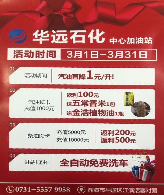 2020年3月疫情得到控制以后,湖南華遠(yuǎn)石化有限公司響應(yīng)政府號(hào)召,支持湘潭市各企業(yè)開展復(fù)工復(fù)產(chǎn)工作,在湘潭市中心加油站率先推出油品單價(jià)掛牌價(jià)直降1元的優(yōu)惠活動(dòng),讓利社會(huì),回報(bào)大眾。另外持華遠(yuǎn)石化加油卡充值優(yōu)惠返利10%,活動(dòng)時(shí)間3月份,長(zhǎng)達(dá)一個(gè)月,此外充值還贈(zèng)送東北五常大米,金浩茶油等基本生活物資。