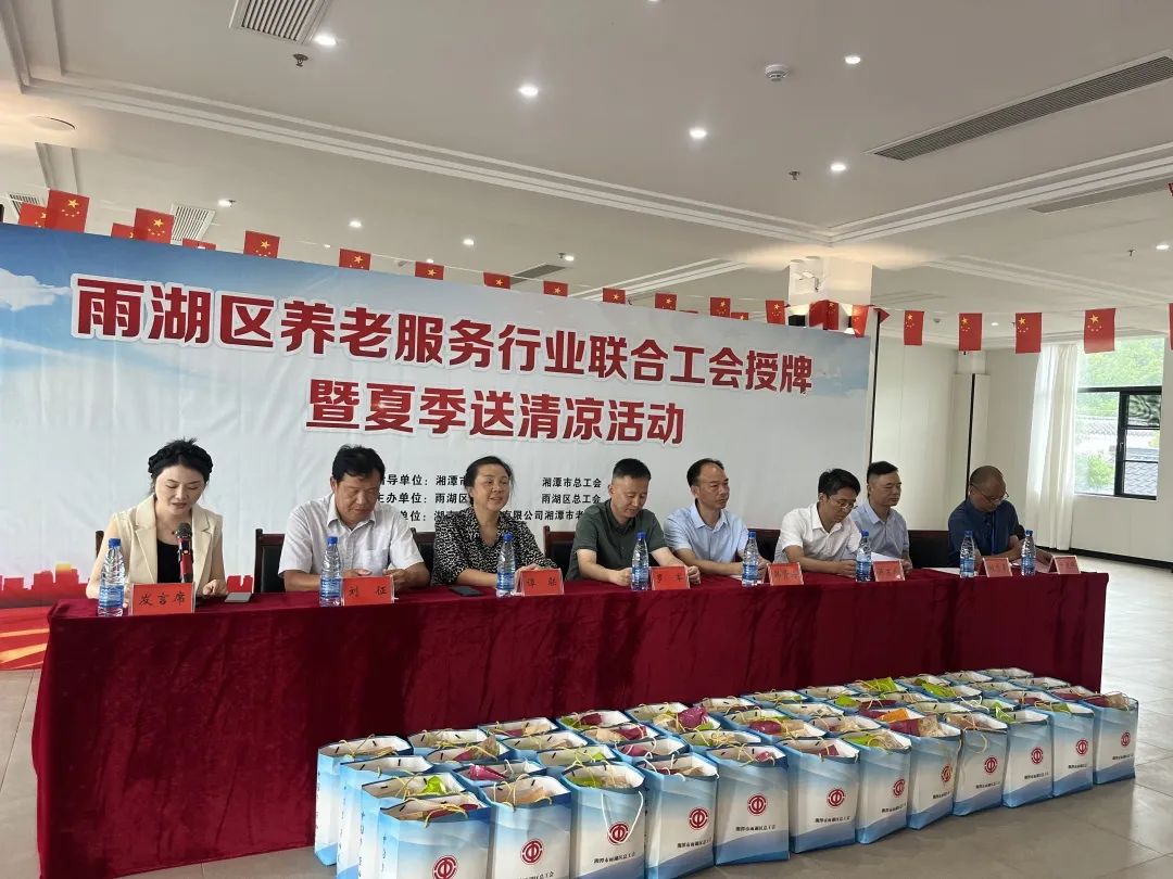 8月23日,雨湖區(qū)養(yǎng)老服務行業(yè)聯(lián)合工會授牌儀式暨夏季送清涼活動在我院舉行。區(qū)總工會黨組書記、常務副主席劉征,人大常委會副主任、區(qū)總工會主席譚聯(lián),市總工會黨組成員、副主席羅軍,湘潭市民政局黨委委員、副局長韓賢海,雨湖區(qū)委副書記蔣文武,市工會組織部部長劉志勇,以及來自雨湖區(qū)各養(yǎng)老機構(gòu)的負責人代表參會,雨湖區(qū)民政局黨組書記、局長干建暉主持會議,華遠康養(yǎng)中心法人譚燦任首屆工會主席。
